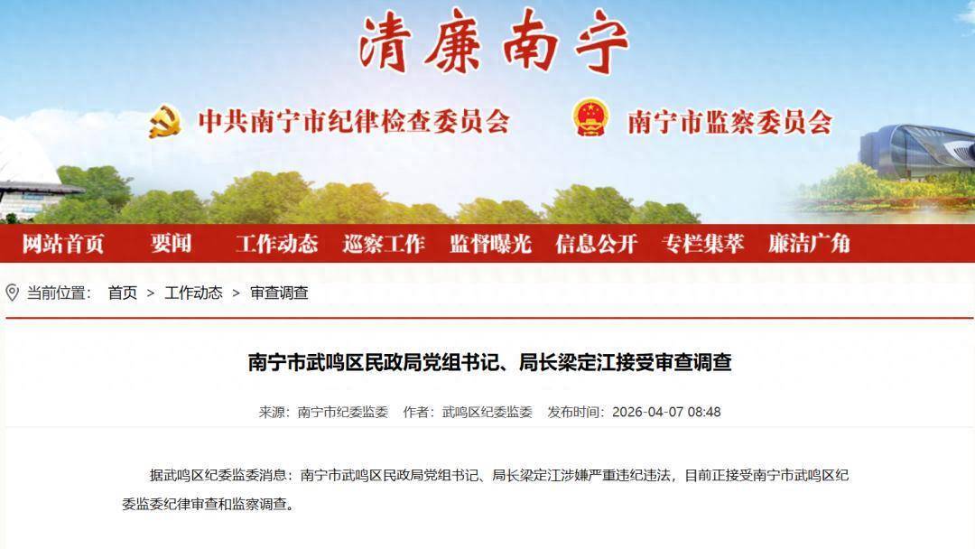 据武鸣区纪委监委消息:南宁市武鸣区民政局党组书记、局长梁定江涉嫌严重违纪违法,目前正接受南宁市武鸣区纪委监委纪律审查和监察调查。