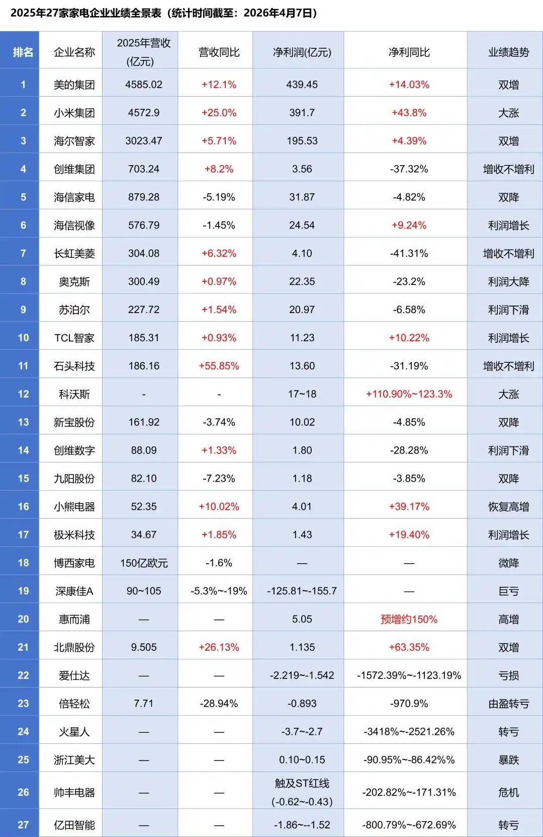 以下是27家家电企业的整体表现: