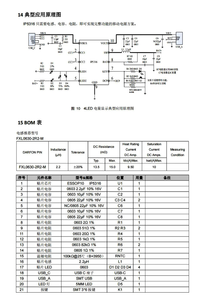 安全是电源管理芯片的重要考量之一。IP5316具备多重保护机制,包括输出过流、过压、短路保护,输入过压、过充、过流保护,以及整机过温保护和电池NTC温度检测功能。此外,它还支持电池高低温保护,ESD防护等级为4KV,输入引脚瞬态耐压为12V,有助于设备在复杂电磁环境下保持稳定运行。